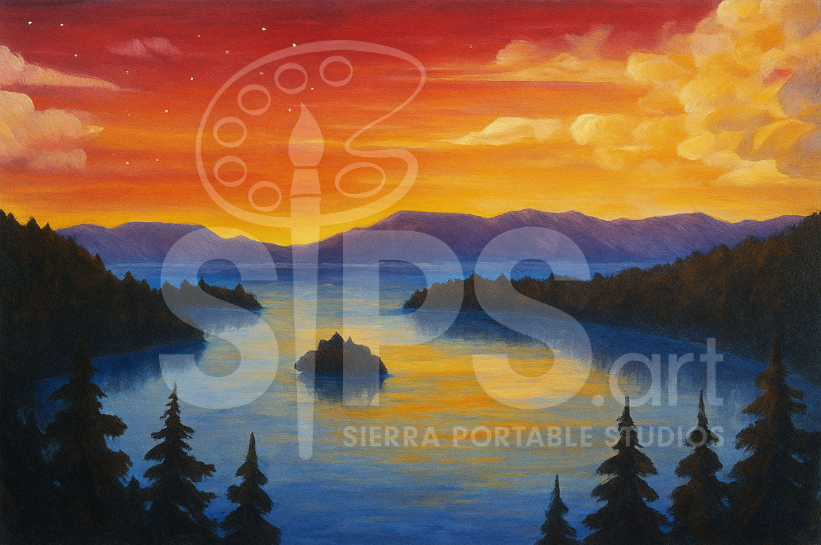 Capture the magic of Lake Tahoe’s most iconic view in this vibrant paint and sip experience. With glowing skies, peaceful waters, and silhouetted pines, this painting is inspired by Emerald Bay at golden hour—a local favorite and a true Sierra treasure.