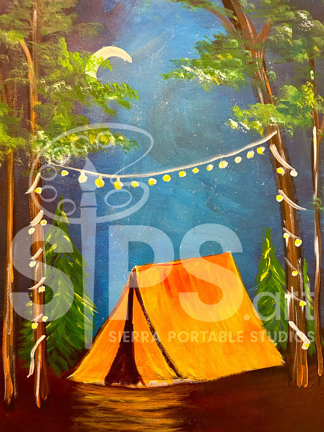 Join us for a night of creativity and craft beer as we paint this cozy summer camping scene—complete with string lights, pine trees, and a glowing tent under the moon. No experience needed—we'll guide you step-by-step as you bring this whimsical forest escape to life on canvas.