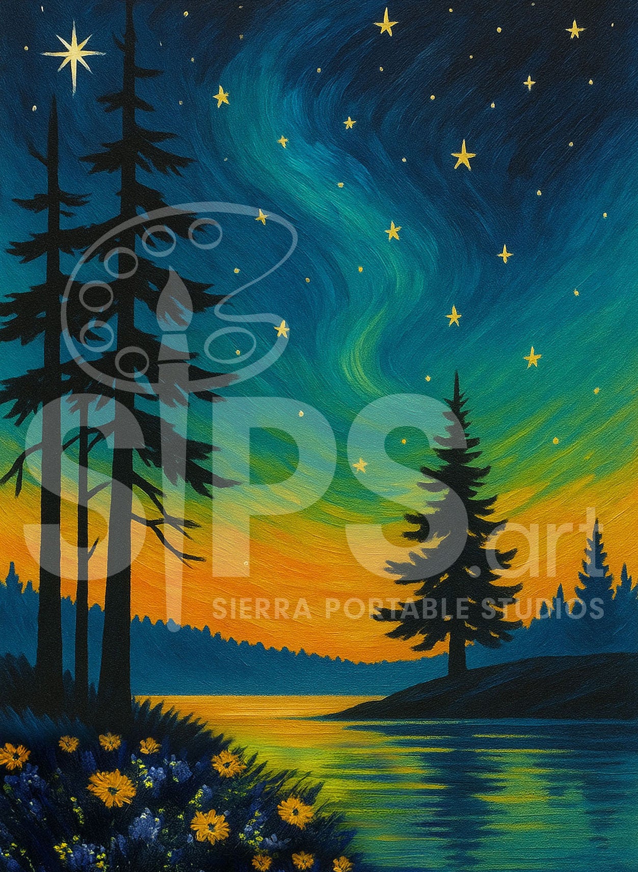 Perfect for beginners and seasoned painters alike, this painting is all about blending bold colors and capturing the beauty of nature in motion. From swirling skies to shimmering reflections, we’ll show you how to bring this dreamy night scene to life.